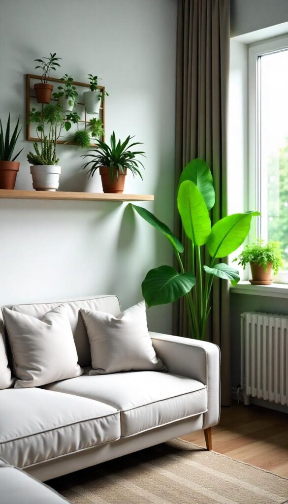 Plants breathe life into any living room. Opt for small, low-maintenance varieties like succulents or ferns. Wall-mounted planters save floor space while adding a fresh, green touch. Use planters with neutral tones or subtle patterns to keep the room cohesive.