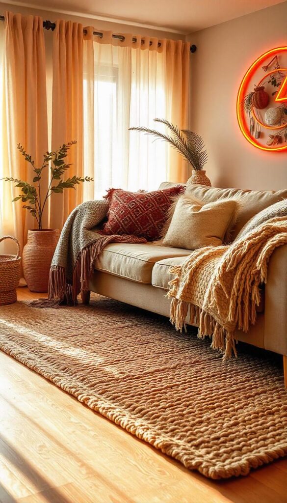A bold area rug is a must-have in bohemian decor. Opt for Moroccan-inspired designs, Persian rugs, or colorful kilims. These rugs not only provide warmth but also serve as the focal point of the room, tying together the various elements.