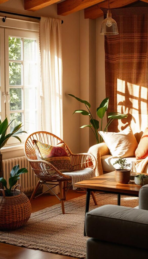 Bring nature into your decor with materials like bamboo, rattan, wicker, and reclaimed wood. A rattan chair or a wooden side table adds an organic feel to the room. These natural elements work beautifully with soft fabrics and greenery, creating a harmonious balance.
