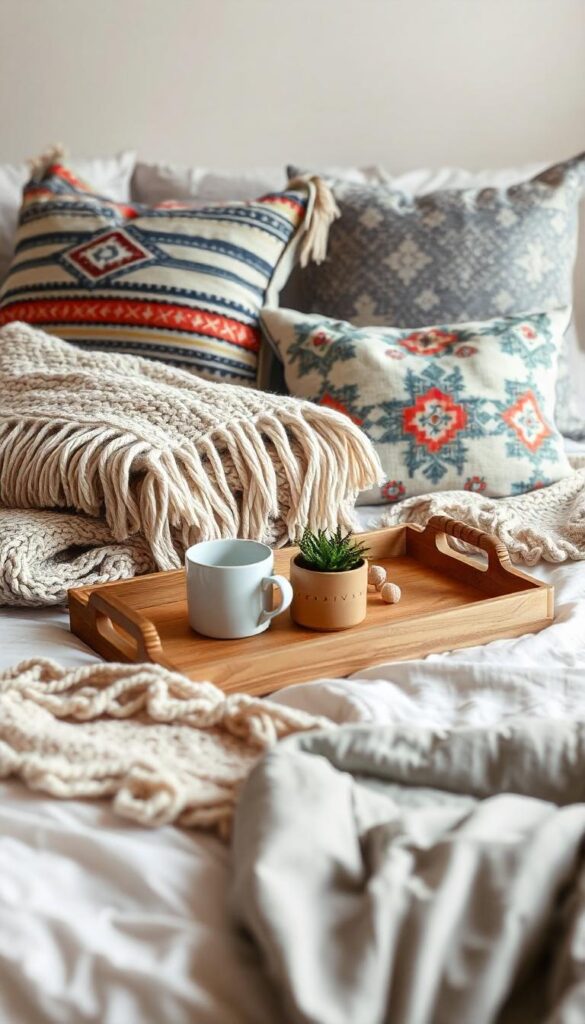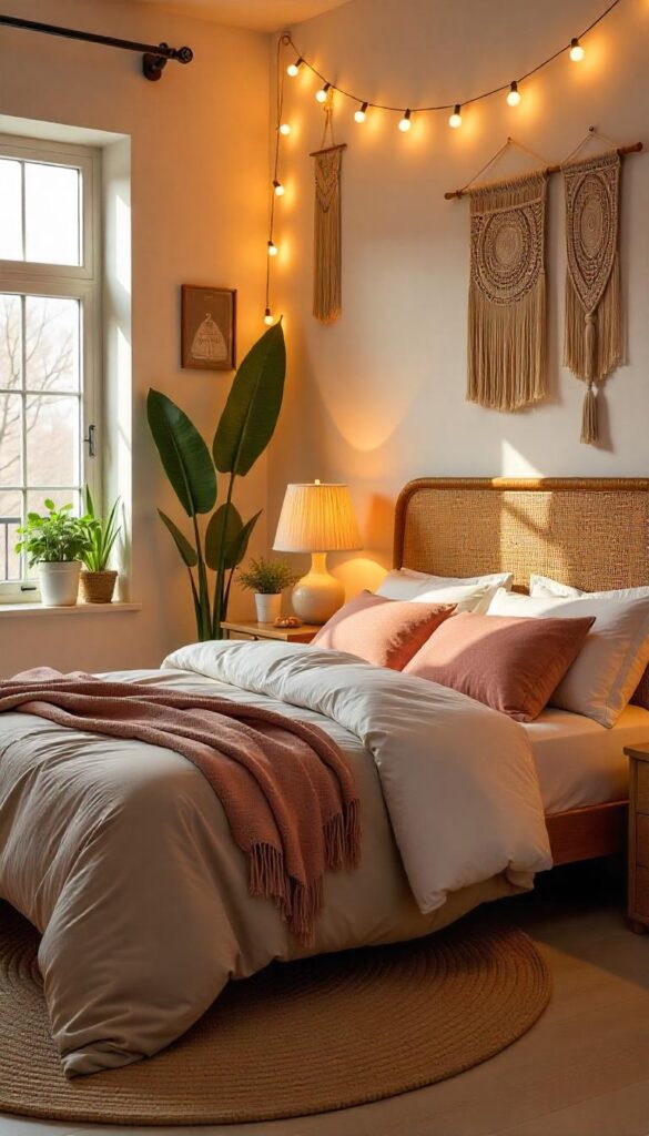 Layering makes a boho bedroom feel rich and inviting. Use blankets, throws, and pillows in various fabrics. Combine cotton, wool, and linen for a mix that’s soft and tactile. Go for mismatched patterns that share a similar color palette.