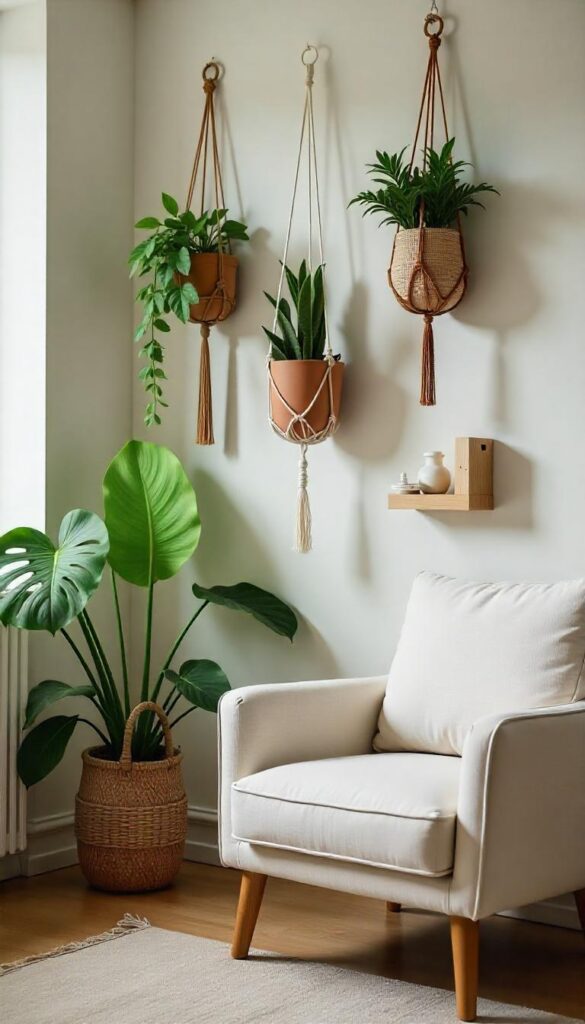 Indoor plants bring life and freshness to a boho bedroom. Choose easy-to-care-for varieties like pothos, snake plants, or succulents. Place them in macramé hangers, woven baskets, or clay pots for a natural touch.