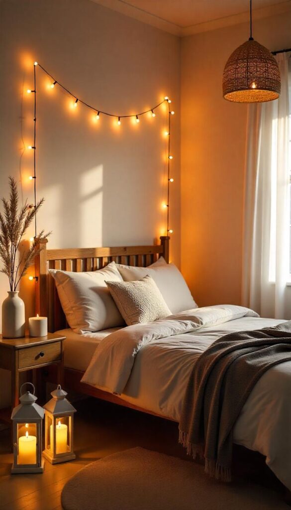 Soft, warm lighting creates a magical atmosphere. String lights, fairy lights, or woven pendant lamps are great options. Lanterns and candles can also enhance the cozy vibe, giving the room a relaxed glow.