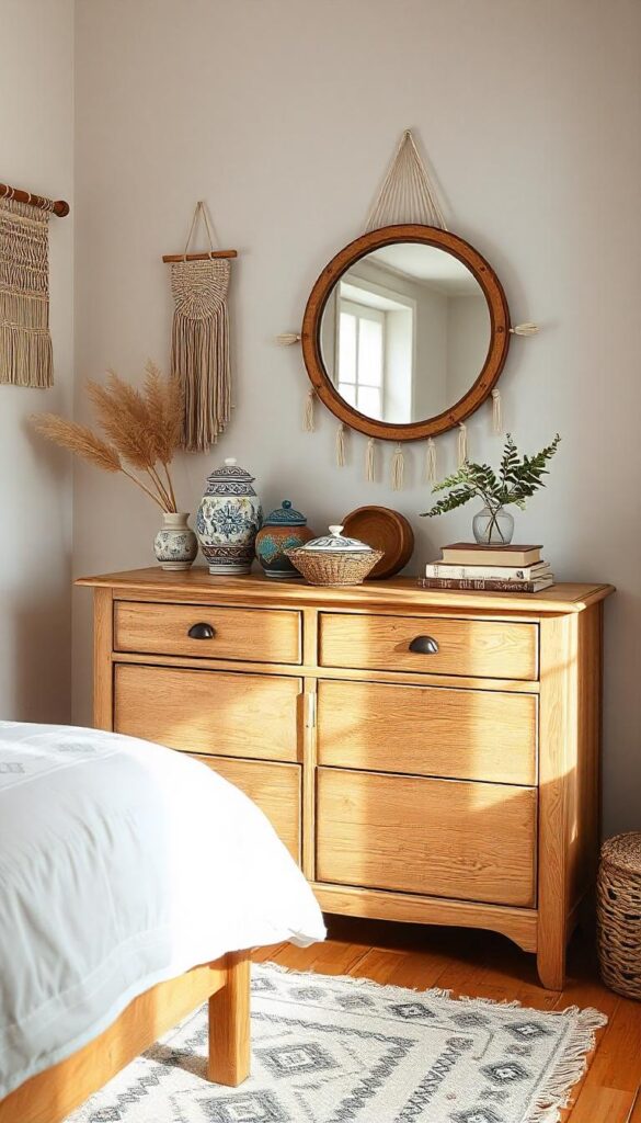 Vintage furniture and accessories bring character to a boho room. A second-hand dresser, antique mirror, or old trunk can become a focal point. These pieces often have unique designs that make your space stand out.