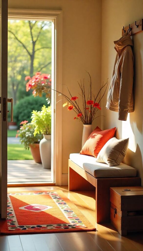 The entryway sets the tone for your home. Add a colorful mat or a cheerful wreath to the door. Use wall hooks for stylish organization. Keep umbrellas and shoes in a neat corner.