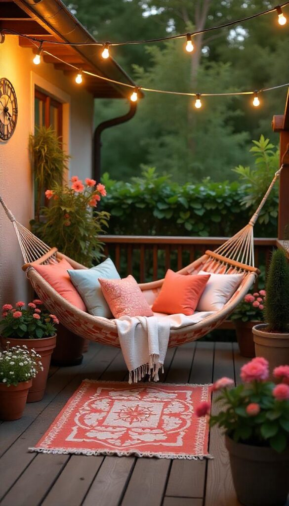 Hang a hammock or swing chair for relaxation. Fairy lights or lanterns create a warm, inviting glow in the evenings. Potted plants or a small herb garden enhance the space.
