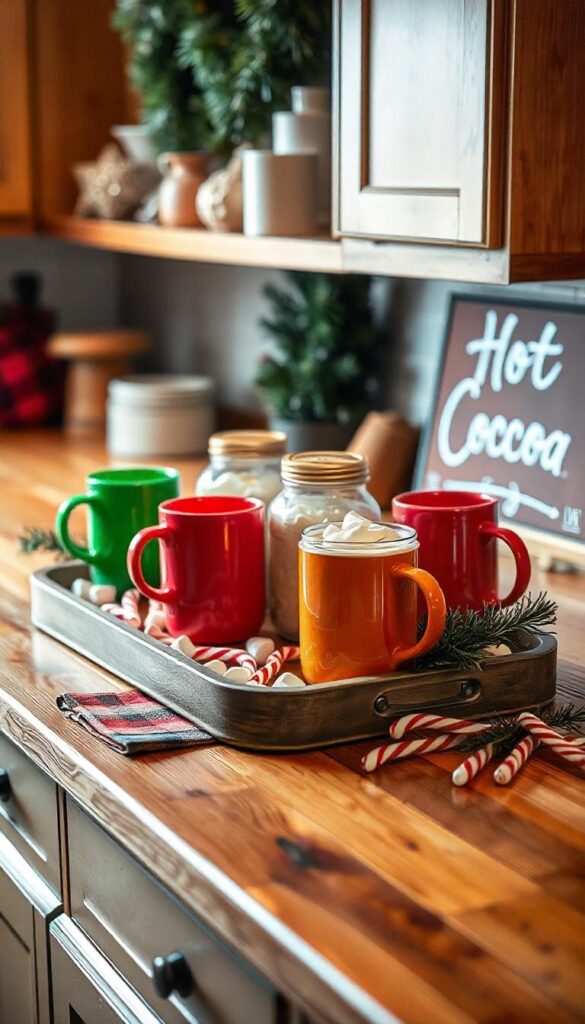 A hot cocoa station adds both functionality and charm to your kitchen. Use a small tray to hold mugs, cocoa powder, marshmallows, and spoons. Add cinnamon sticks or candy canes for extra flavor. Decorate the area with a small garland or a handwritten sign for a cozy, personal touch.