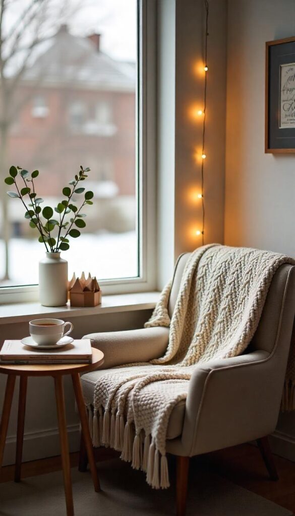 Create a quiet corner to relax and unwind. A comfortable chair, a soft blanket, and a good lamp are all you need. Add a small side table for books, a cup of tea, or a candle. A basket with extra throws or pillows completes the cozy setup.